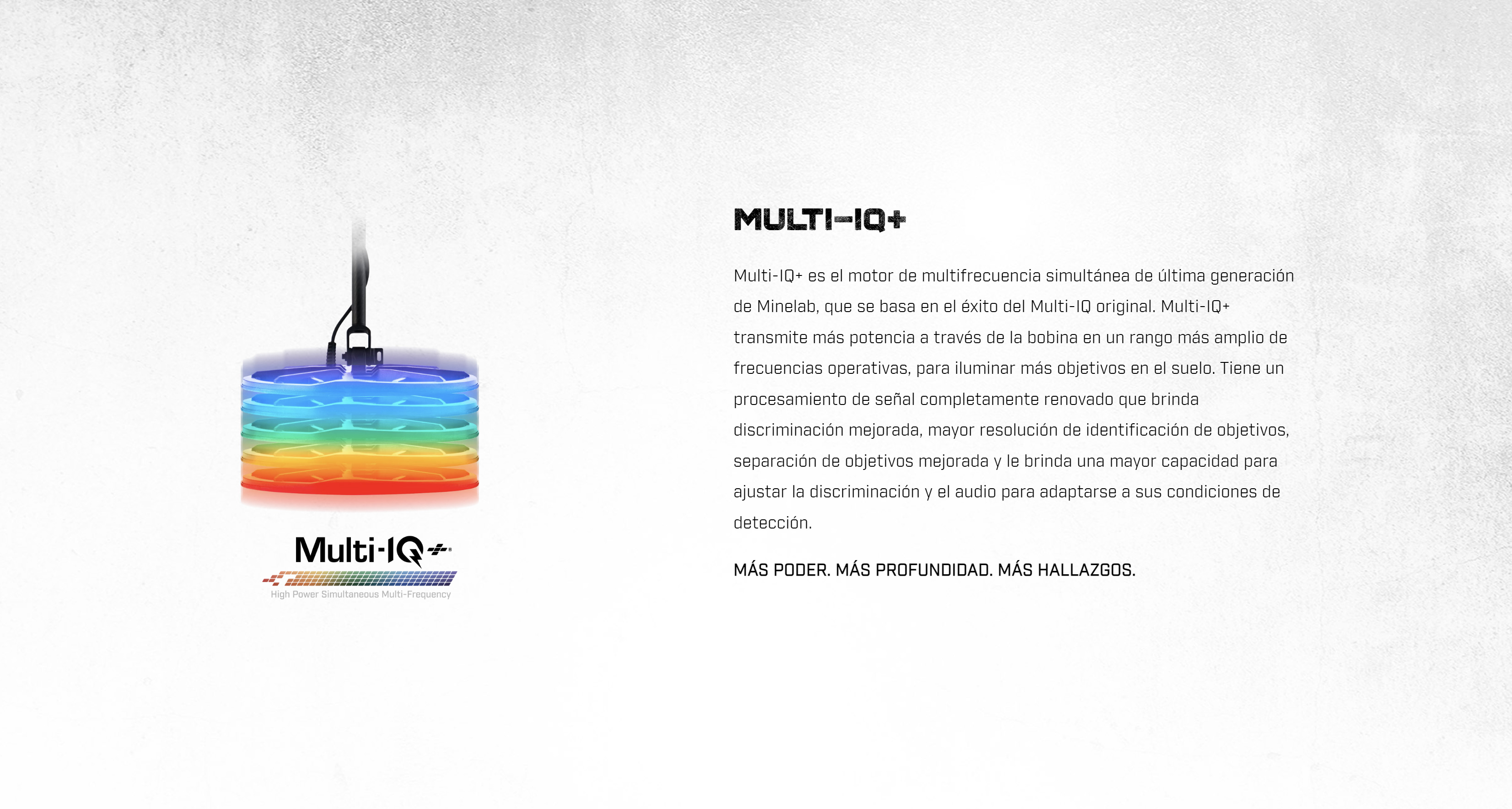 Basado en el éxito del Multi-IQ original, Multi-IQ+ transmite más potencia a través de la bobina en un rango más amplio de frecuencias operativas, para iluminar más objetivos en el suelo. Tiene un procesamiento de señal completamente renovado que proporciona una discriminación mejorada, una mayor resolución de identificación de objetivos, una separación de objetivos mejorada y te brinda una mayor capacidad para ajustar la discriminación y el audio para adaptarse a tus condiciones de detección.