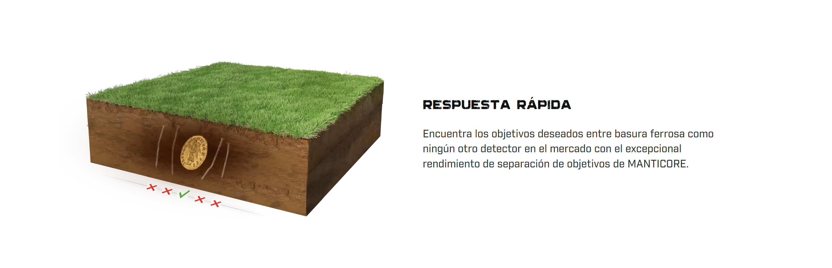 MANTICORE ofrece 10 modos de búsqueda personalizables, incluido todo terreno optimizado para la detección en tierra; Playa optimizada para zonas de arena, oleaje y agua de mar; y Goldfield optimizado para detectar pepitas de oro.