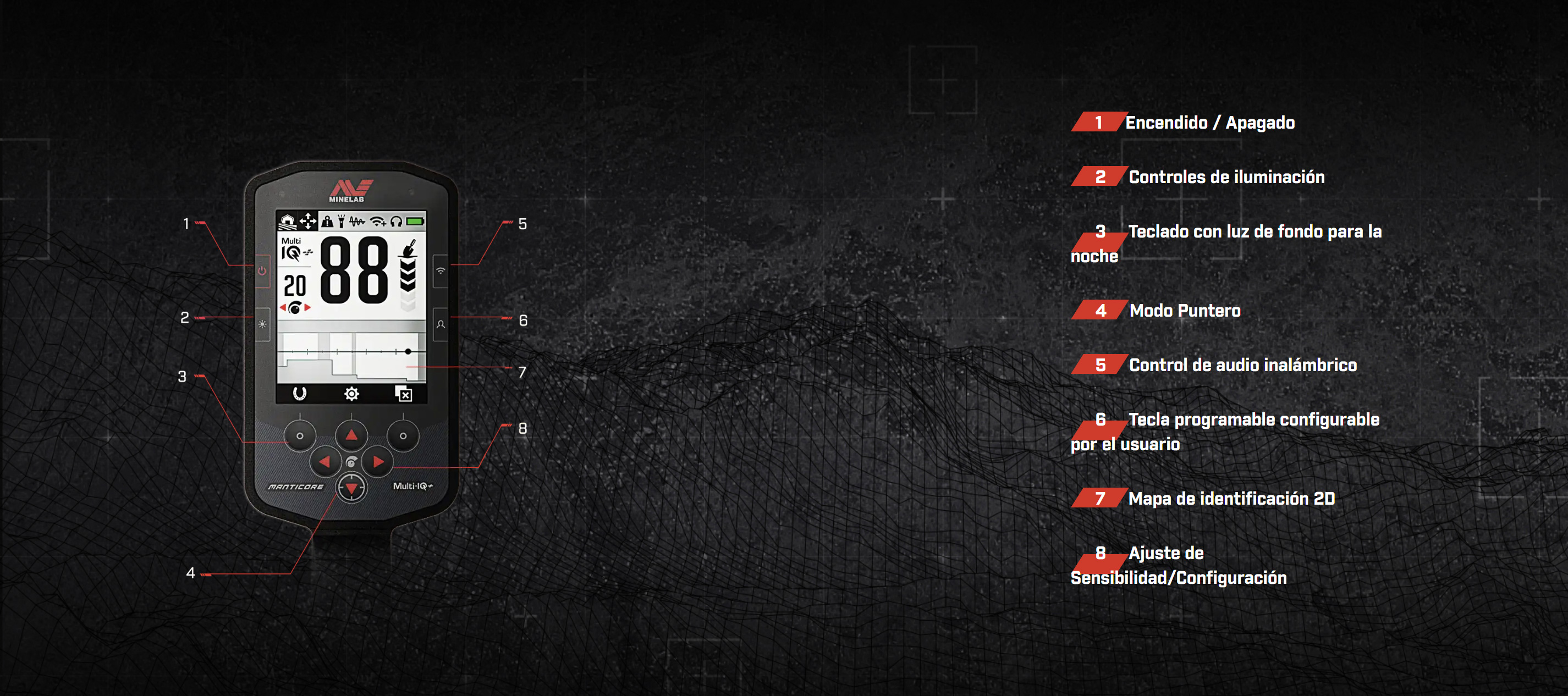 MANTICORE con Multi-IQ+ es el detector de metales más potente, rápido y preciso en la historia de Minelab. El corazón de MANTICORE es su motor multifrecuencia simultánea (MULTI-IQ+) sobrealimentado.