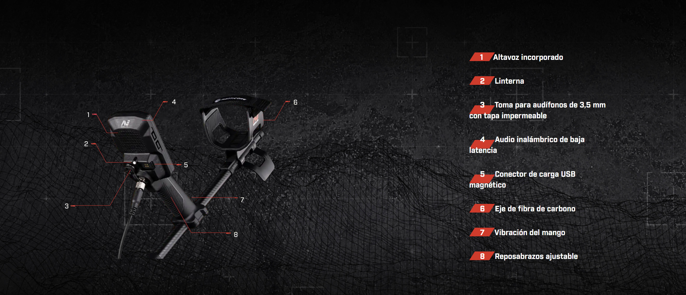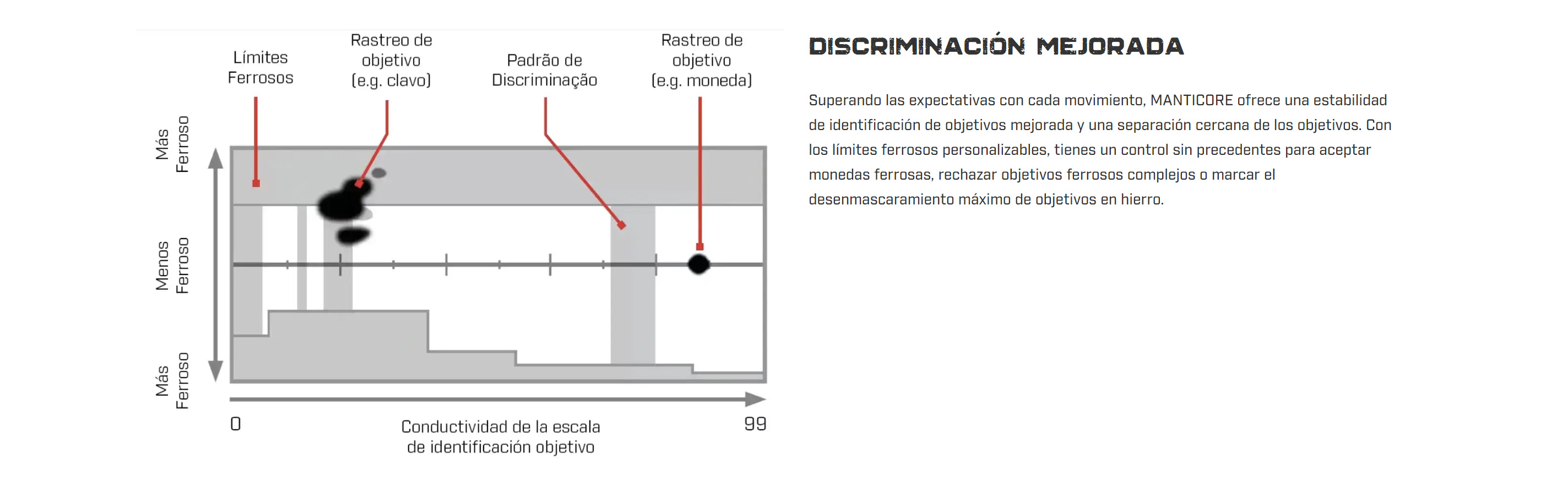 Toma el control del audio con MANTICORE. Escuche la información del objetivo de la manera que le gusta a través de controles de audio superiores que incluyen tonos de objetivo personalizables, supresión de interferencias electromagnéticas (EMI) y audio de tono continuo (VCO) con tonos ferrosos y tono de detección de umbral genuino.