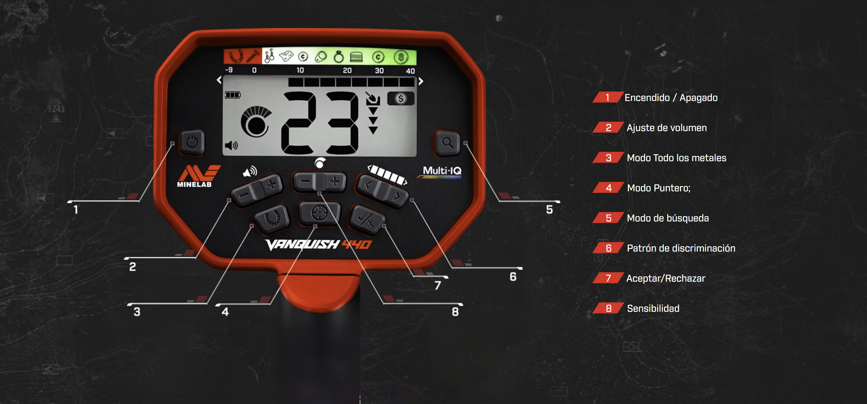 VANQUISH 440: creado para el detectorista que busca mejorar su desempeño. Armado con tecnología Multi-IQ, bobina V10 impermeable y control de audio, el 440 también cuenta con modo preciso. Perfecto para quienes exigen precisión. Tan simple como potente, la construcción compacta y liviana del VANQUISH 440 ofrece resultados, sin importar a dónde te lleve la caza.