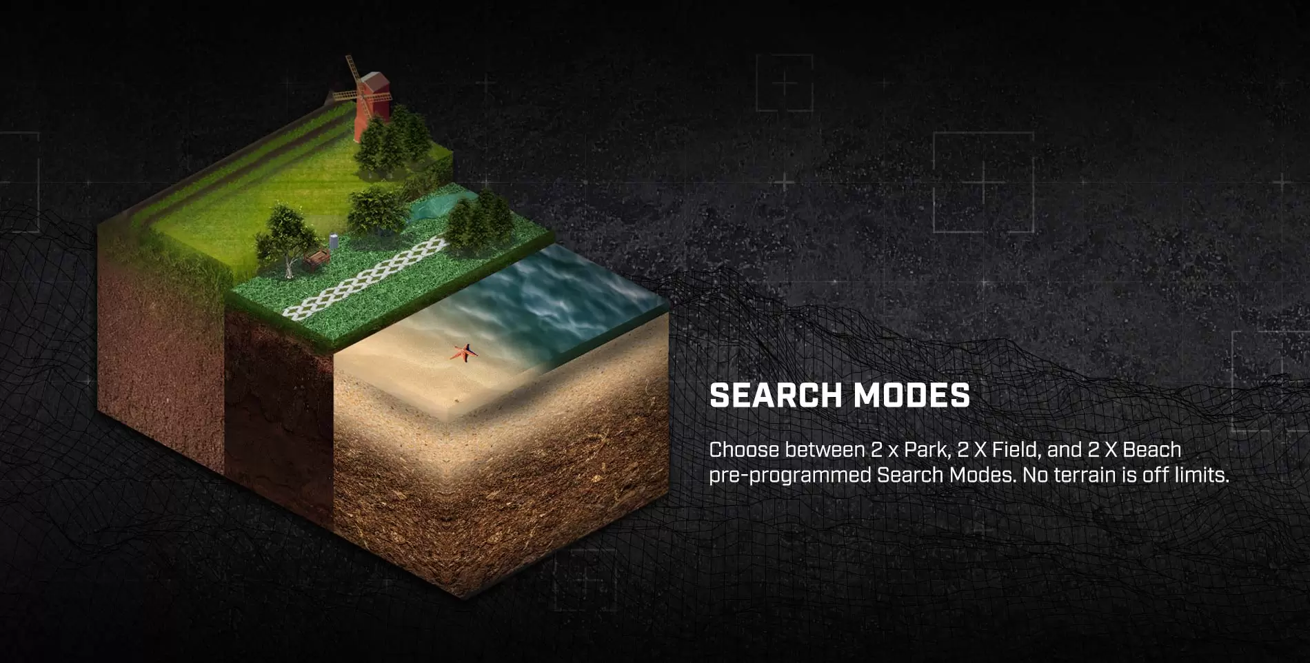 Con una cápsula de control y una bobina a prueba de agua hasta 5 m (16 pies), lleve X-TERRA PRO a cualquier lugar (tierra o agua) y sea dueño del suelo bajo sus pies. X-TERRA PRO de Minelab domina en la playa y un modo de playa dedicado maneja las condiciones de agua salada más difíciles.